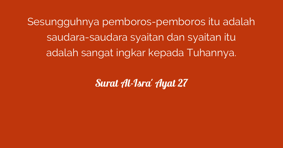 Tolong admin untuk share atau membagikan artikel surat al quran per ayat ini agar lebih banyak lagi yang membaca al quran. إِنَّ ٱلْمُبَذِّرِينَ كَانُوٓا۟ إِخْوَٰنَ ٱلشَّيَٰطِينِ ۖ وَكَانَ ٱلشَّيْطَٰنُ لِرَبِّهِۦ كَفُورًا. Nah sahabat, itulah surat al isra ayat 27 untuk anda baca sehari hari atau untuk anda hafalkan, semoga bermanfaat. Sudah sejauh mana interaksi anda dengan ayat ini? Isi kandungan surat al isra' ayat 26 27.