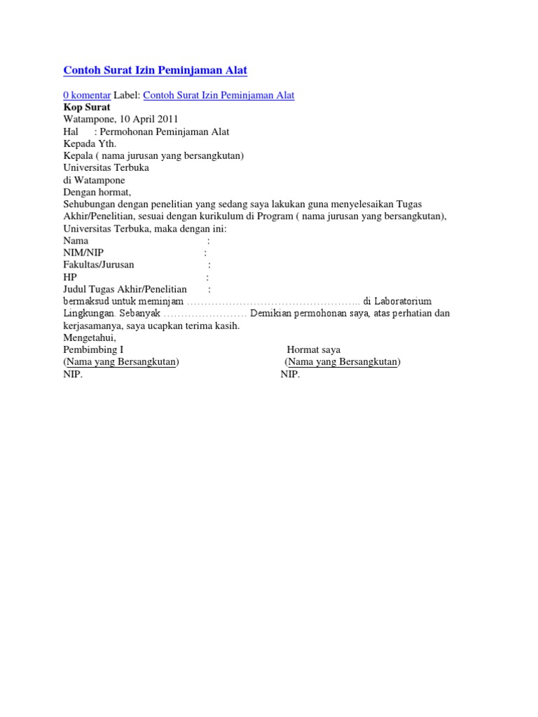 Contoh surat permohonan untuk peminjaman alat beratdeskripsi lengkap. Kop surat watampone, 10 april 2011 hal : Para pendidik tenaga kependidikan khususnya bagian tata usaha bidang administrasi sebagai motor utama penggerak administrasi sekolah tentunya dituntut. Text of contoh surat peminjaman alat. Inilah contoh surat peminjaman tempat dan alat. Surat peminjaman tempat ini hampir mirip dengan surat permohonan bantuan dana. Dari satu surat pinjaman diwaktu yang sama dan tempat yang sama. Apakah perlu meminjam sebuah lokasi melalui surat? Atas terkabulnya permohonan ini, saya ucapkan banyak terimakasih. • surat peminjaman pada perusahaan. Savesave contoh surat permohonan peminjaman alat for later. Kumpulan contoh surat permohonan untuk kerjasama, rekomendasi, bantuan dana, permohonan maaf, beasiswa atau keperluan yang lain dengan penulisan yang baik dan benar. Kementrian pendidikan dan kebudayaanuniversitas sebelas maret surakartafakultas kedokterankelompok mahasiswa (kema) diploma iii hiperkes & kk jalan kolonel.