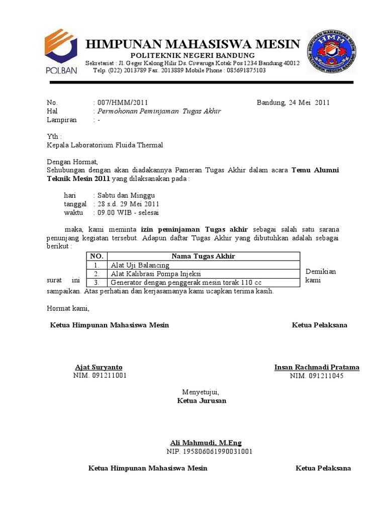 Contoh surat permohonan untuk peminjaman alat beratdeskripsi lengkap. Demikianlah surat permohonan peminjaman alat ini kami sampaikan, atas perhatian dan bantuannya kami ucapkan terima kasih. Setiap penggunaan alat dan laboratorium harus diketahui teknisi/laboran atas izin kepala lab atau penanggung jawab praktikum. Documents similar to contoh surat permohonan peminjaman alat. Para pendidik tenaga kependidikan khususnya bagian tata usaha bidang administrasi sebagai motor utama penggerak administrasi sekolah tentunya dituntut. Kepala program studi d.iii hiperkes dan kk di tempat dengan hormat, sehubungan akan diadakannya kegiatan kominfo fest 2014 lomba video k3, yang akan diadakan pada. Surat peminjaman tempat ini hampir mirip dengan surat permohonan bantuan dana. Mengajukan peminjaman ijazah sarjana asli, ijazah tersebut akan digunakan sebagai. Kumpulan contoh surat permohonan untuk kerjasama, rekomendasi, bantuan dana, permohonan maaf, beasiswa atau keperluan yang lain dengan penulisan yang baik dan benar. Sebelumnya aku memposting surat peminjaman alat antar organisasi. Surat peminjaman barang sering kali ditunjukkan ketika kamu akan meminjam barang. Savesave contoh surat permohonan peminjaman alat for later. Contoh surat peminjaman merupakan salah satu surat resmi yang biasanya di gunakan dalam peminjaman barang atau asset pada perusahaan atau kelembagaan lainnya.