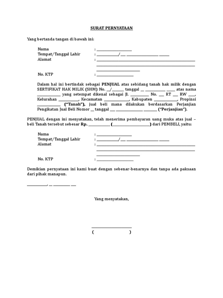Surat perjanjian jual beli tanah. Blangko surat perjanjian pernyataan jual beli tanahfull description. Serta harus menjelaskan tentang kapan dan bagaimana cara penyerahan. Segala macam biaya yang berhubungan dengan balik nama atas tanah berikut bangunan yang terletak di atasnya dari pihak pertama kepada pihak kedua sepenuhnya. Surat perjanjian jual beli tanah dan bangunan. Periksa dengan saksama contoh surat pernyataan jual beli tanah rumah.com berikut ini sebelum menandatanganinya. Meski hanya selembar atau dua lembar namun surat ini memiliki nilai finansial yang cukup tinggi. Pentingnya faktor legalitas dalam transaksi jual beli tanah tidak bisa ditawar lagi. Surat jual beli tanah tersebut nantinya akan dijadikan sebagai bukti dan memiliki kekuatan hukum yang kuat sehingga tidak akan bisa digugat lagi. Jual beli tanah harus dilengkapi dengan surat perjanjian yang resmi. Contoh akta jual beli tanah yang baik.full description. Silahkan kunjungi postingan surat pernyataan dan kwitansi jual beli tanah untuk membaca artikel selengkapnya dengan klik link di atas. Bahwa pihak i menjual sebidang tanah berikut segala yang ada di atasnya kepada pihak ii dengan harga rp.
