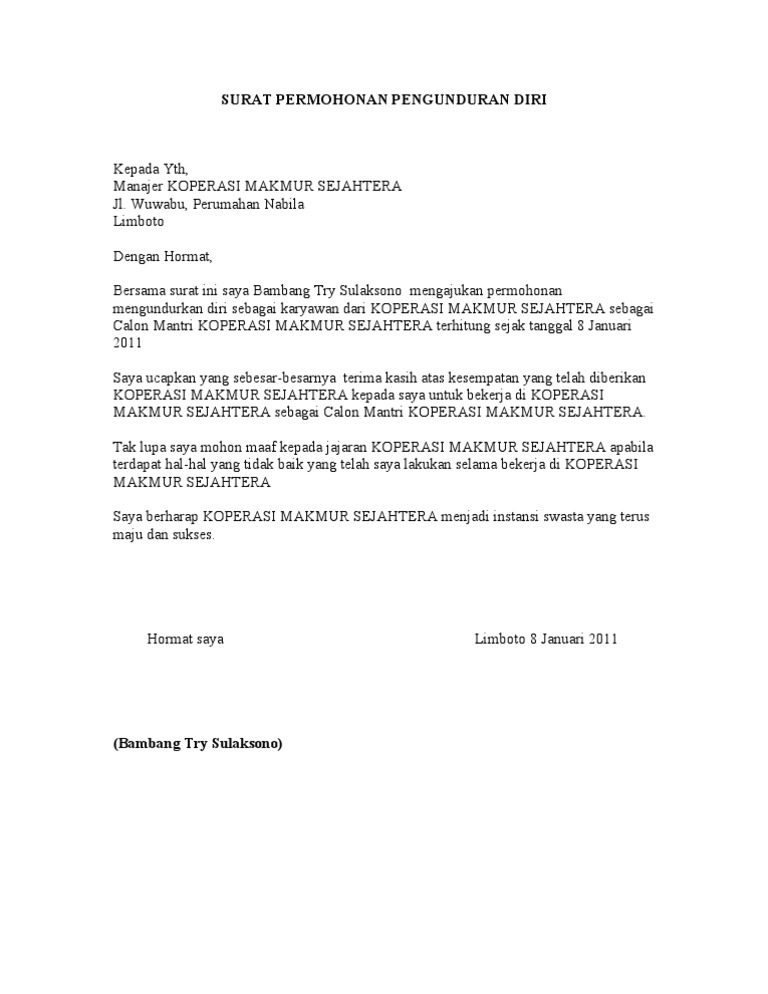 Makanya dalam dunia perdokumenan dan surat menyurat. Termasuk mengundurkan diri dari pekerjaan yang telah mereka tekuni selama beberapa waktu. Contoh surat pengunduran diri kerja yang baik dan sopan. Alasan pengunduran diri seoarang karyawan bisa beraneka ragam. Menyatakan bahwa saya mengundurkan diri dari jabatan saya.